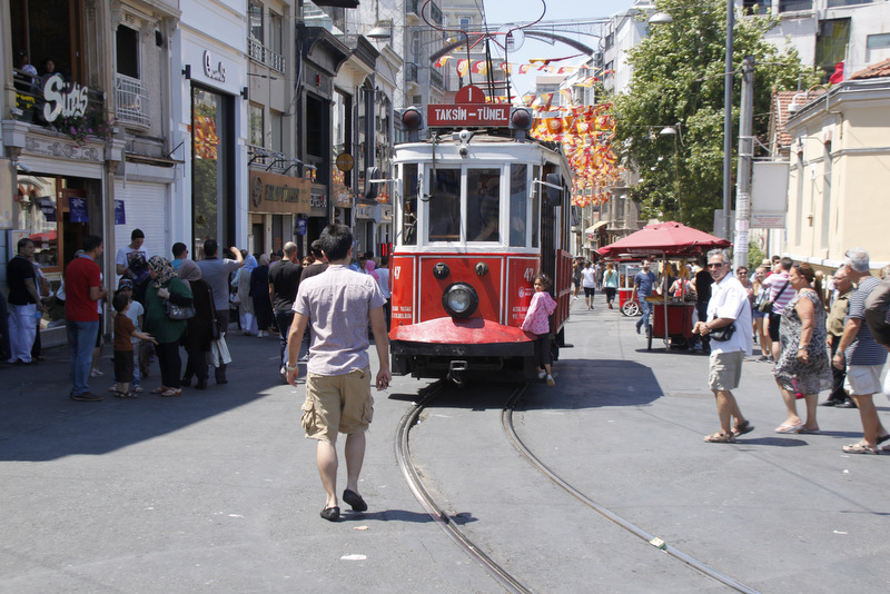 Do modernega evropskega Taksima smo se peljali s starim tramvajem, kar je prav tako posebno doživetje. Vendar bi človek kar najraje skočil dol s sicer počasnega vlaka, ko zagleda niz številnih trgovin ob glavni ulici Istiklal. Vseeno smo počakali do Trga Taksim in nadaljujevali peš nazaj do stolpa Galata, ki smo si ga ogledali že pred vožnjo s tramvajem in je lepa razgledna točka. Zgrajen je bil sredi 14. stoletja in je bil dolgo najvišja zgradba v mestu.