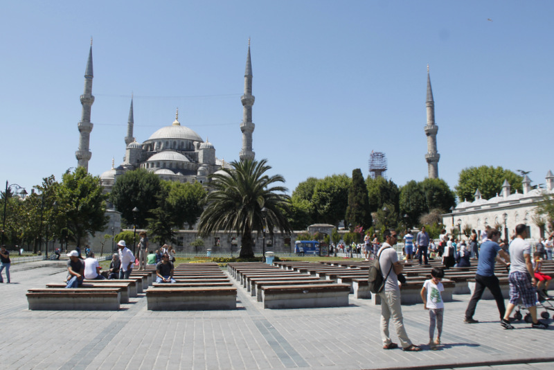 Sprehodili smo se do bližnje Modre mošeje, ki je dobila ime po modrih ploščicah iz katerih je bila v 17. stoletju zgrajena. Graditelj je zamenjal besedi zlata in šest, ki sta v turškem jeziku podobni, in ji zgradil kar šest minaretov, kar je bilo v takratnem času največ na svetu, in ne zlate kot je želel Sultan Ahmed I., ki je dal mošejo zgraditi. Glavna mošeja v Meki – prestolnici islama je imela le pet minaretov, so ji morali zaradi carigrajskega pripetljaja dozidati še dva. Mošeja ima lepo dvorišče kot tudi notranjost z rdečkastimi ročno tkanimi preprogami, ogromnimi lestenci in modrimi vzorčastimi ploščicami. Potrebno je biti primerno obut in oblečen, zato smo dobili posebna ogrinjala, kar je navadno tujcem zanimiva izkušnja. Del mošeje je namenjen vernikom, ki jih obiskovalci lahko z razdalje seveda, opazujejo pri molitvi.