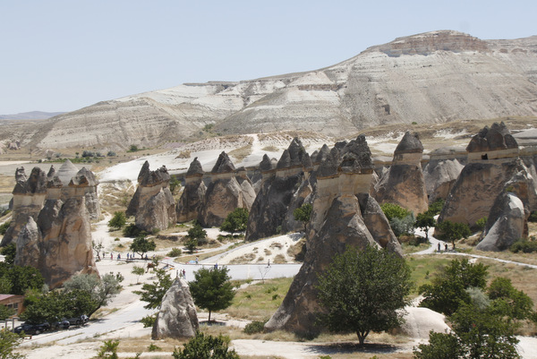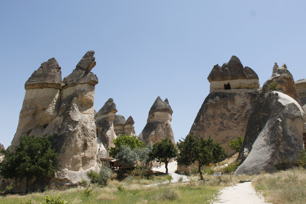 Pred ca. 9 do 3 milijoni let so v Kapadokiji bruhali trije vulkani (Hasan, Erclyes in Melendiz). Pokrajino je prekrila debela plast vulkanskega pepela, ki se je strdila v mehko kamnino – tuf, ponekod je bila debela tudi do 10 m. S kasnejšo  kombinacijo erozije (voda, veter) in ekstremnih vremenskih razmer je nastala pokrajina z zanimivimi dimniki, ki jo nekateri primerjajo z nezemeljsko, nadrealistično, kot bi se človek sprehajal po Luni, futuristično in s podobnimi opisi. Vetru in vodi so lahko kljubovale le najtrše kamnine, ki danes tvorijo stožce, stebre, vrhove, gobe in podobne oblike, ki segajo tudi do 40 m visoko. Zato je tudi vsaka dolina drugačna in unikatna. Poznamo dolino ljubezni, dolino gobic, dolino dimnikov, kameljo dolino, Gaudijevo dolino…