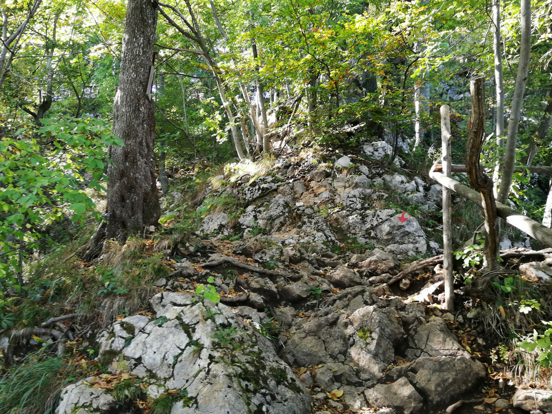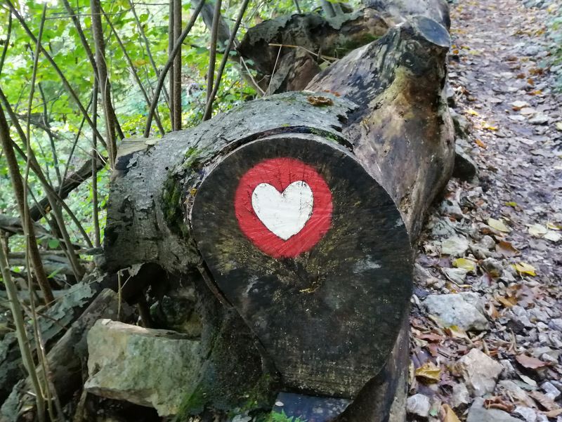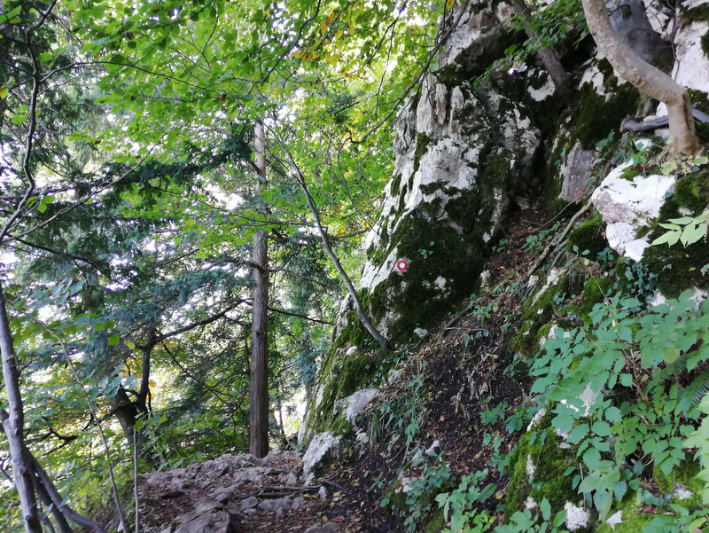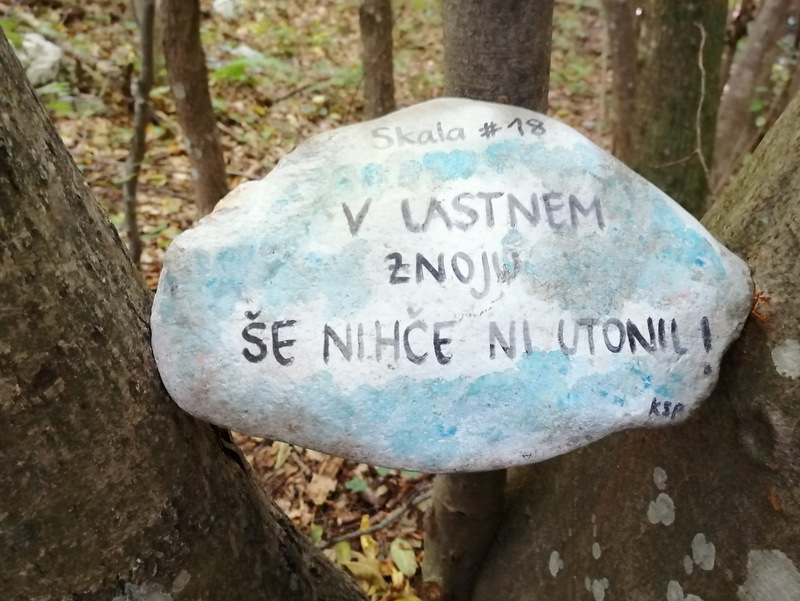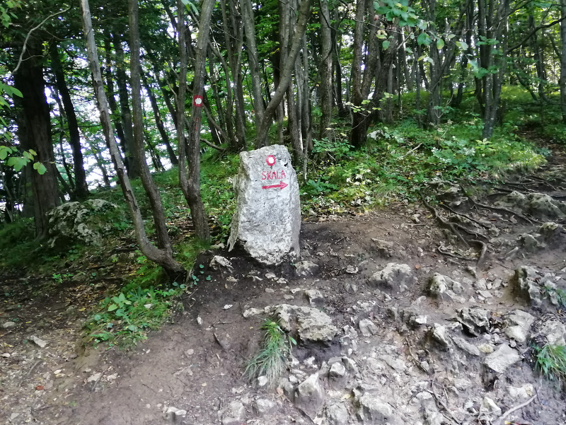 Naslednji cilj je bila Skala. Do nje vodi označena pot, ki je lepo popestrena s spodbudnimi mislimi zapisanimi na kamne. Za Skalo sem prebrala, da je zelo priljubljena pri domačinih. Nekateri se podajo do razgledišča s klopco in vpisno knjigo že pred službo, nekateri pa tudi popoldne po njej. Zadnji del poti lahko izberemo ali želimo iti po lažji ali zahtevnejši poti. Zahtevnejša je v bistvu plezalna pot, kjer so nameščene jeklenice in skobe ter lepo popestri pot do vrha.