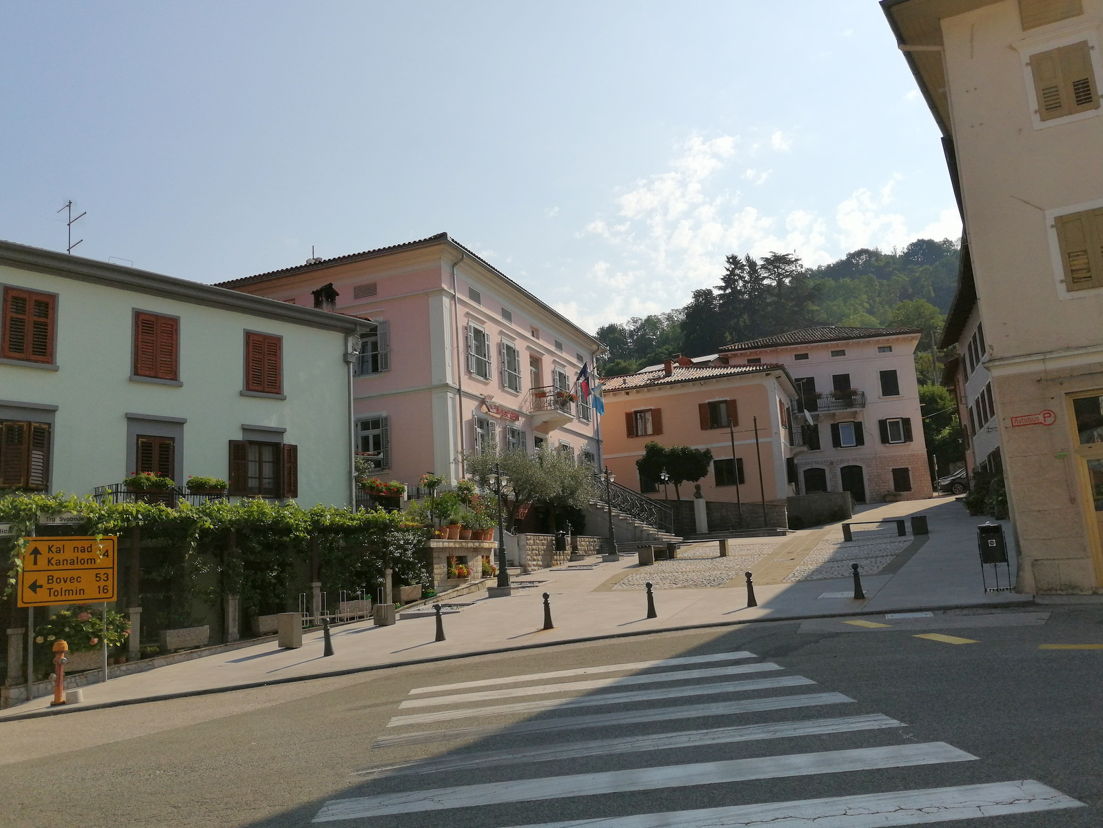 Stari del mesta, t.i. Kontrada, stoji na ozki terasi levega brega Soče in ima okrog osrednjega trga Na placu in ob Gasi ozke ulice v sklenjeni pozidavi. Od nekdanjega obzidja, ki je nekoč obdajalo naselje, so ostali le štirje stolpi oz. bastijoni: na Kontradi je preurejen v Galerijo Rika Debenjaka, v vogalnem stolpu se nahaja gostilna, tretji je skrit med hišami v središču naselja, četrti pa je porušen. Kontrado, ki je osrednji prostor kulturnega dogajanja v poletnih mesecih, obdaja kompleks z Gotsko hišo, Kolarjevo hišo, ki je delno preurejena v razstavni prostor, galerijo in spominsko sobo grafika Rika Debenjaka. Tu je tudi nekaj lokalov, kjer se velja usesti in opazovati domačine.