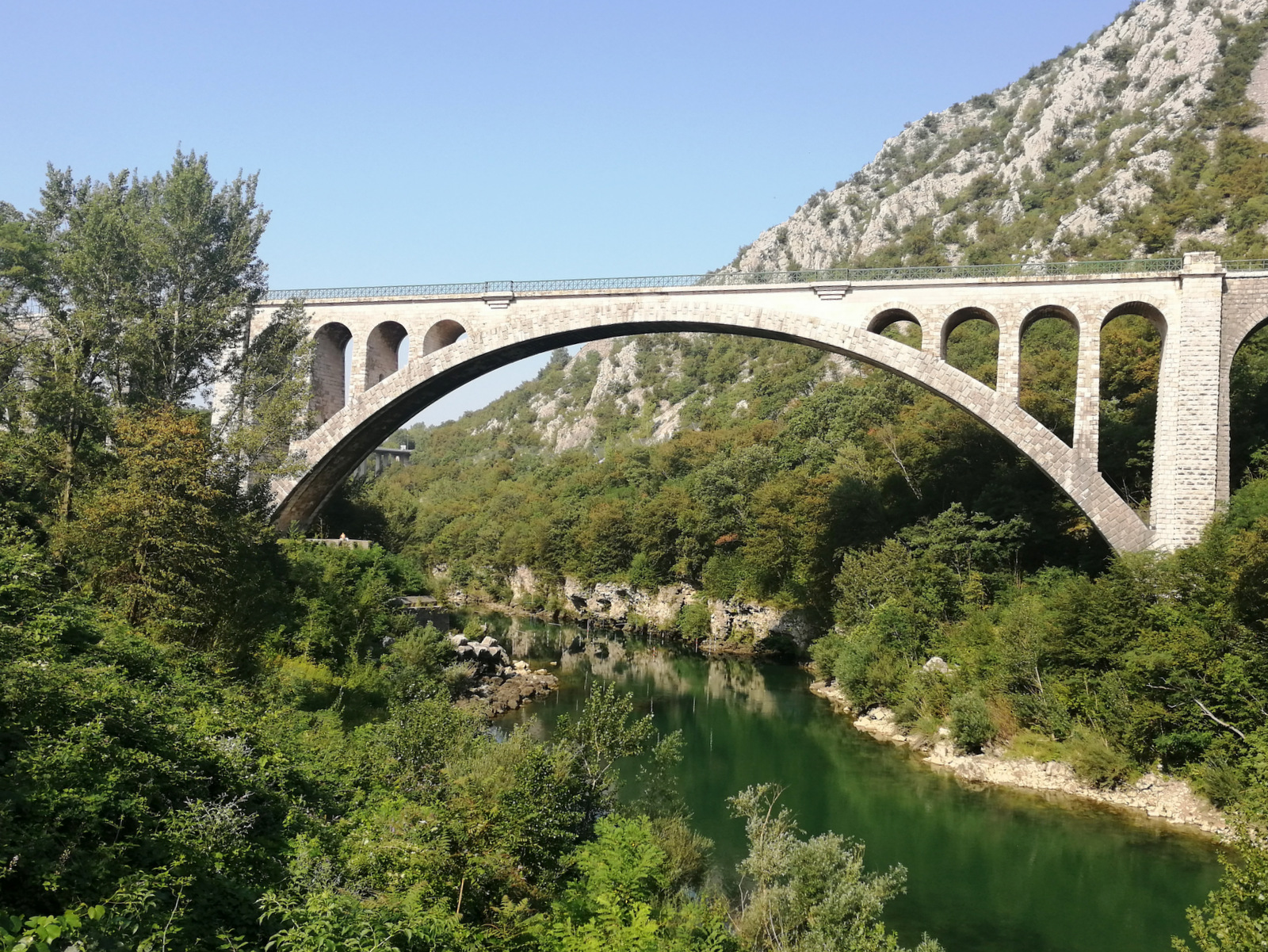 Za konec smo se ustavili še ob Solkanskem mostu oziroma viaduktu. Gre za 219,70 m dolg železniški ločni most čez reko Sočo pri Solkanu, ki je bil nekoč eden izmed 65-ih mostov in viaduktov na bohinjski progi, zgrajeni med letoma 1900 in 1906, ki je pomenila povezavo Srednje Evrope in Sredozemlja. Pne se 36 m nad srednjo gladino reke in velja z osrednjim lokom s svetlobno odprtino 85 m za največji kamniti most na svetu. Obstajajo sicer tudi večji ločni mostovi, vendar ne kamniti. Pri poznejših tehnikah gradnje so pričeli uporabljati armirani beton.