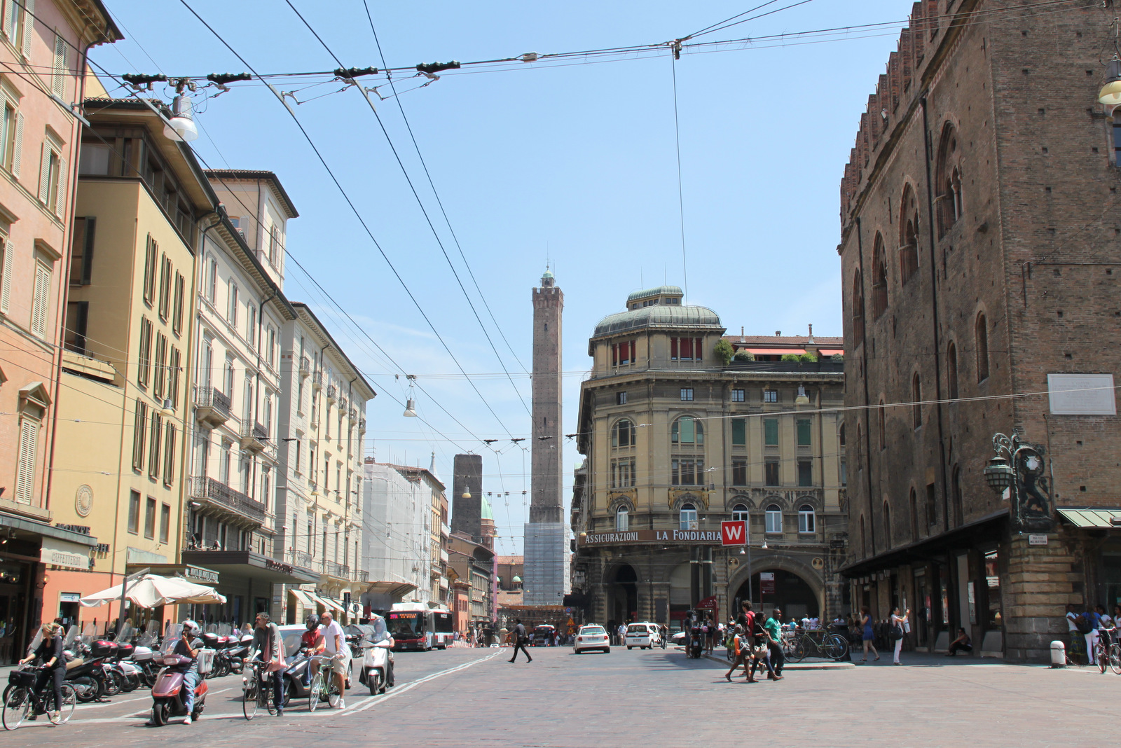 Posebnost mesta so obrambni stolpi, ki jih je bilo nekoč čez 200, danes jih je ohranjenih okrog 20. Iz mestne silhuete izstopata dva zgrajena v 12. stoletju. Z njihovo velikostjo so nekoč družine dokazovale svojo moč in bogastvo. Asinelli je visok 97 m in nagnjen preko svoje osi za 1 m, do vrha vodi 500 stopnic; Garisenda pa je visok »le« 47 m, za obiskovalce je zaprt, saj je nagnjen od svoje osi za kar 3 m. Ogledali smo si še številne stare palače, kot so Palazzo Comunale z zanimivo kolekcijo renesančnih slik in skulptur, nekdanjo zgradbo magistrata Palazzo del Podesra, ki je bila zgrajena okrog leta 1200, grobnice Tombe dei Glossatori, kjer so bili pokopani številni glosatorji – pravniki iz 13. stoletja. Za konec smo se povzpeli še na hrib nad mestom, kjer se nahaja mogočna bazilika Madonna di San Luca, od koder se ponuja lep razgled na staro mestno jedro.
