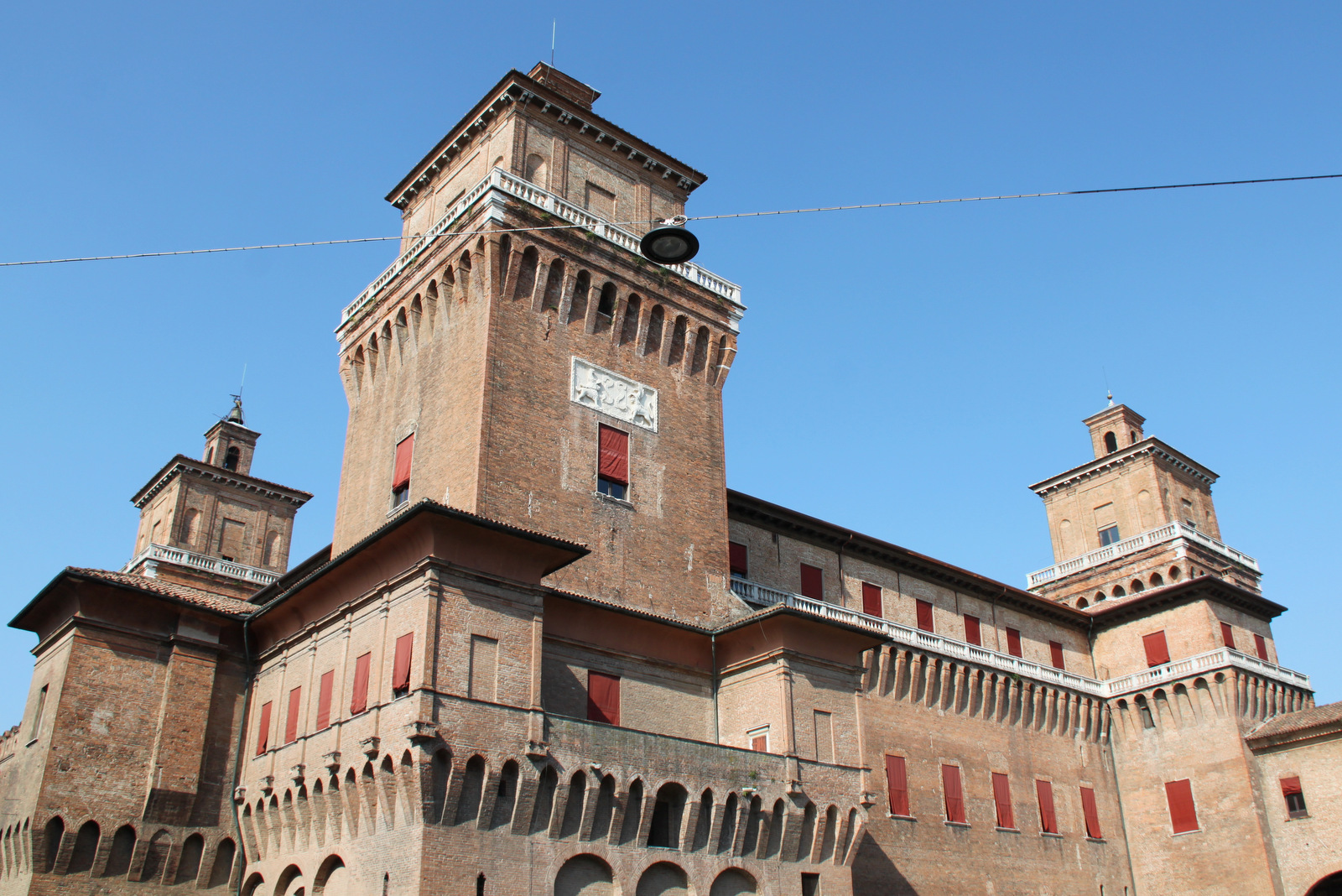 Ogled smo pričeli z zanimivim in nenavadnim domovanjem vplivne rodbine Este. Grad Estenze je v osnovi vojaška utrdba in je svojo podobo dobival več stoletij. Njegova posebnost je, da ga v celoti obdaja kanal. Zanimiva je tudi zgodba njegovih prebivalcev. Konec 15. stoletja je predstavnik omenjene družine Eracole želel preurediti mesto in najel arhitekta Biagia Rossettija. Njegov humanistični koncept idealnega mesta pomeni začetek modernega urbanističnega planiranja; arhitektu je prinesel naziv najpomembnejši renesančni arhitekt, mestu pa naziv najmodernejše italijansko mesto svojega časa. Razvoj urbanizma v Ferrari je imel velik vpliv na razvoj mestnega planiranja v nadaljnjih stoletjih. Isti arhitekt je zaslužen tudi za mestno obzidje. Mesto obdaja 9 km dolgo srednjeveško obzidje, katerega velik del je ohranjen še danes.