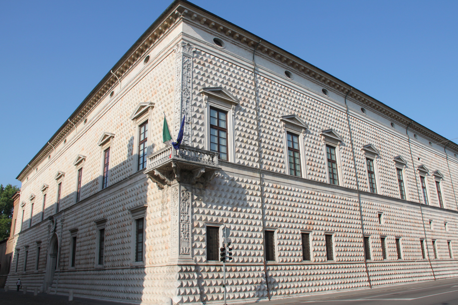 Sprehodili smo se še mimo številnih lepo ohranjenih palač s čudovitimi atriji in urejenimi vrtovi kot so Casa Romei, Pallazzo Schifanoia, Palazzo della Ragione ter cerkva sv. Franje, San Benedetto, Santa Maria in Vado, San Domenico, San Paolo, renesančna cerkev San Cristoforo in drugih. Med prvimi najbolj pritegne pozornost Pallazzo dei Diamanti z zanimivo in nenavadno fasado. Krasi jo kar 8.500 diamantov, a seveda ne pravih ampak marmornih blokov v obliki tega dragocenega kamna. Kot drugje v Italiji, je treba tudi tukaj pokukati v notranjost znamenitosti. Ogledali smo si niz fresk v Dvorani mesecev, ki predstavlja enega največjih dosežkov renesančnega slikarstva v mestu in priča o tem, kako veliko ljubitelji umetnosti so bili predstavniki družine Este, ki so v mesto pritegnili celo vrsto umetnikov, pesnikov, filozofov in renesančnih humanistov.