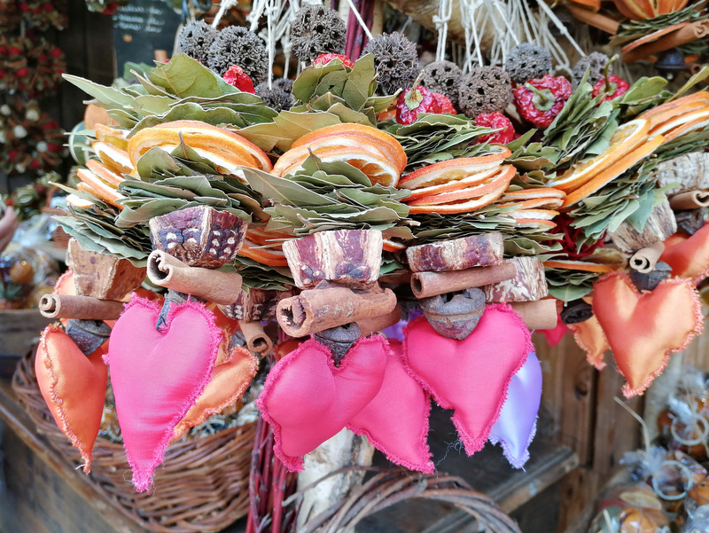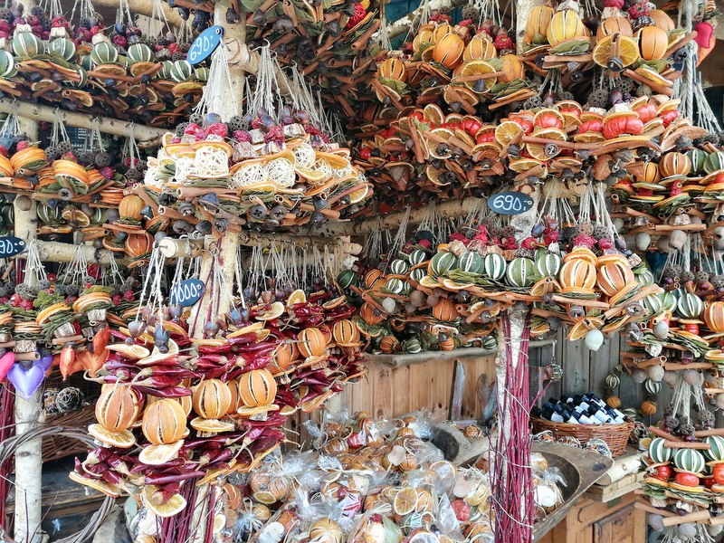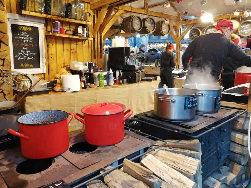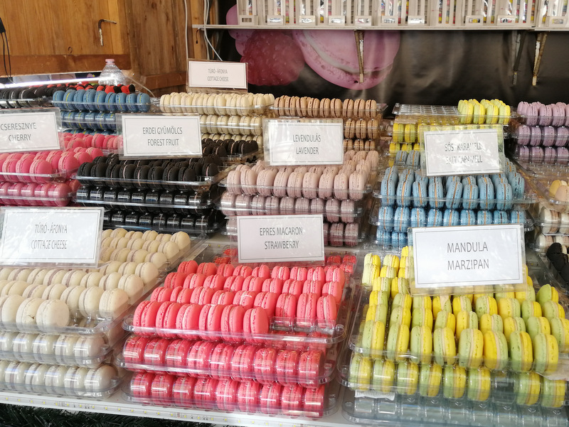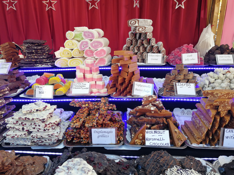 Na stojnicah prodajajo veliko sladkih stvari – od lično zavitih bonbonov, čokolad, slaščic iz suhega sadja in marcipana, pa pekovskih izdelkov, zavitke (retes), jedi na žlico, golažev, zelja, klobas, langašev, kurtos kalacs, pa čaj, kuhano vino (forralt bor) itd.