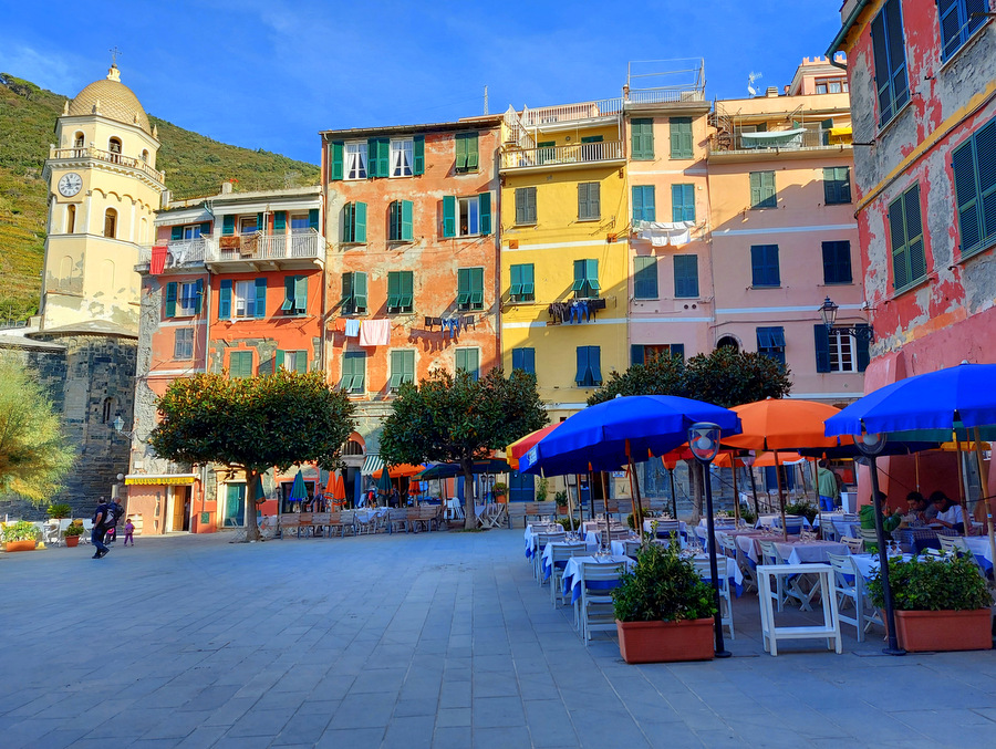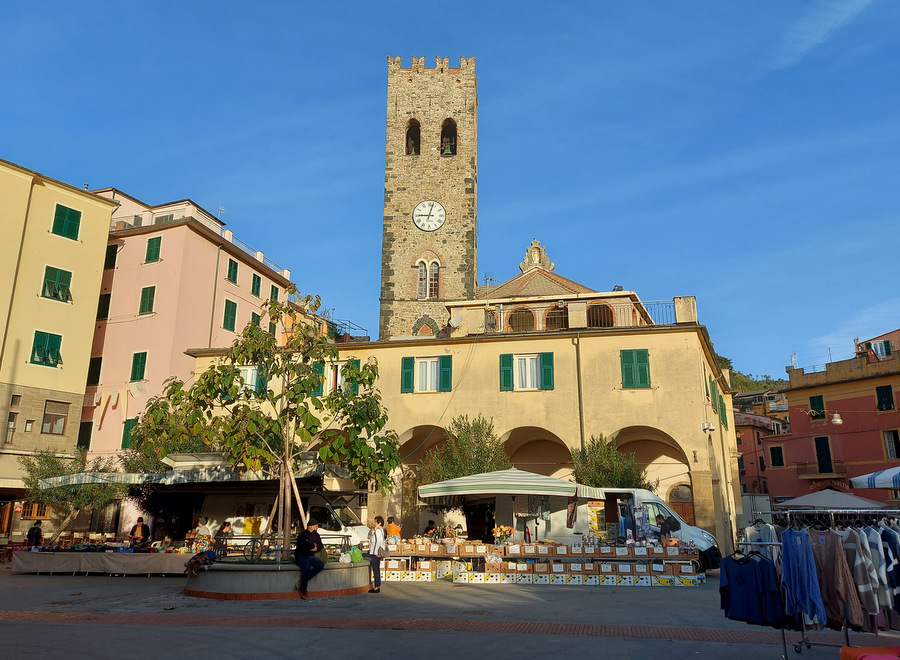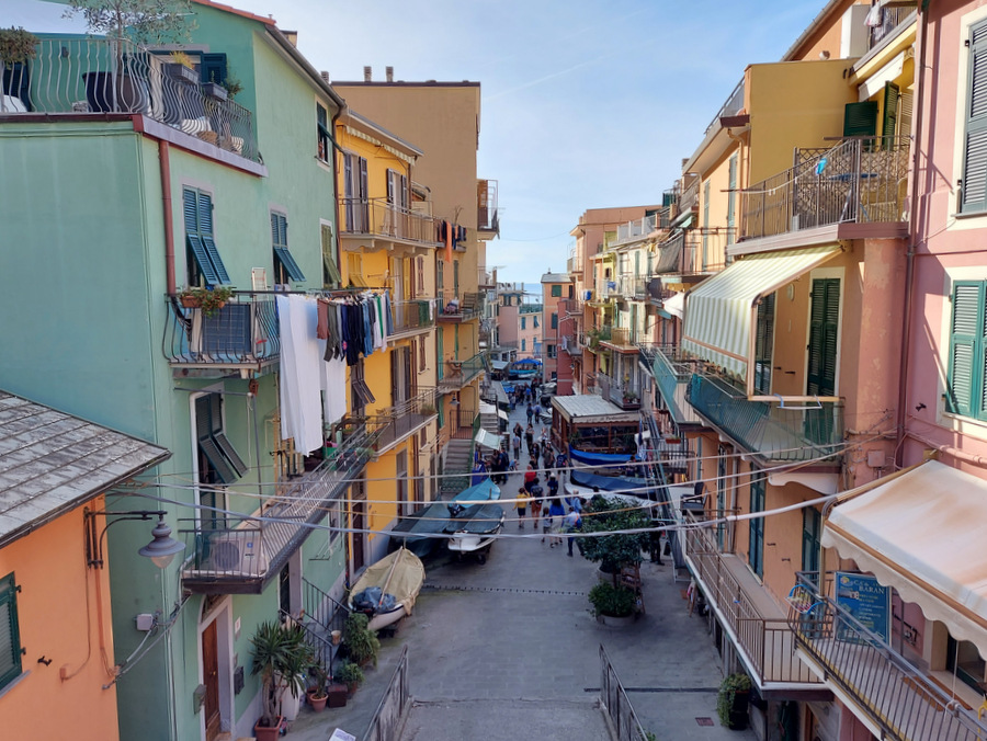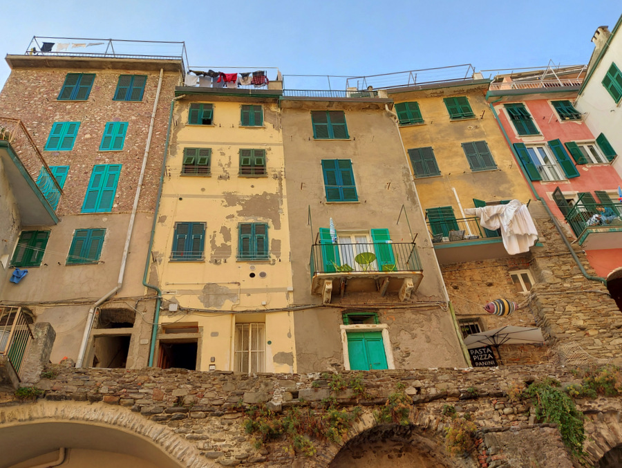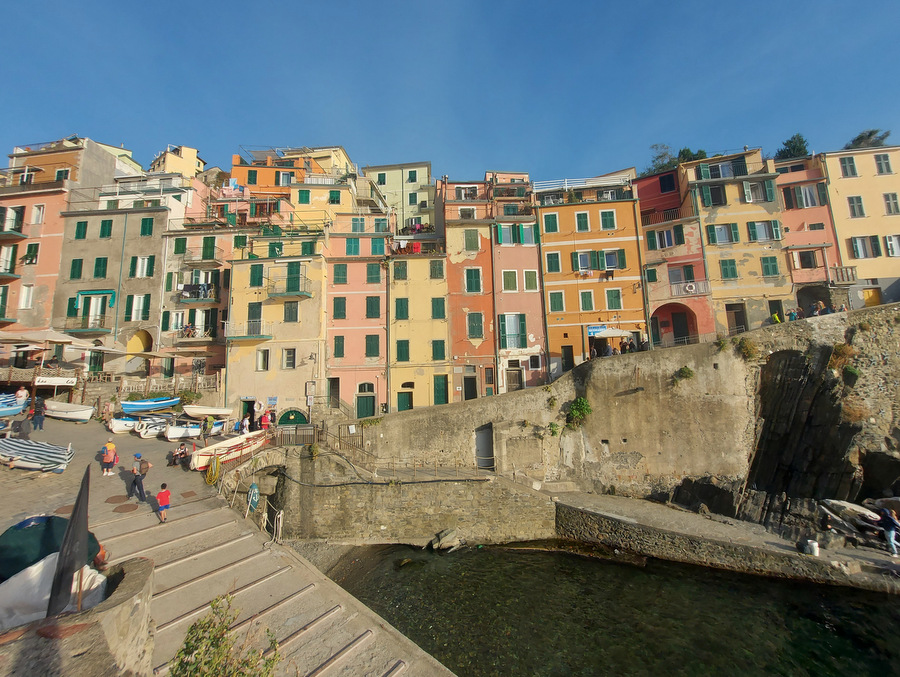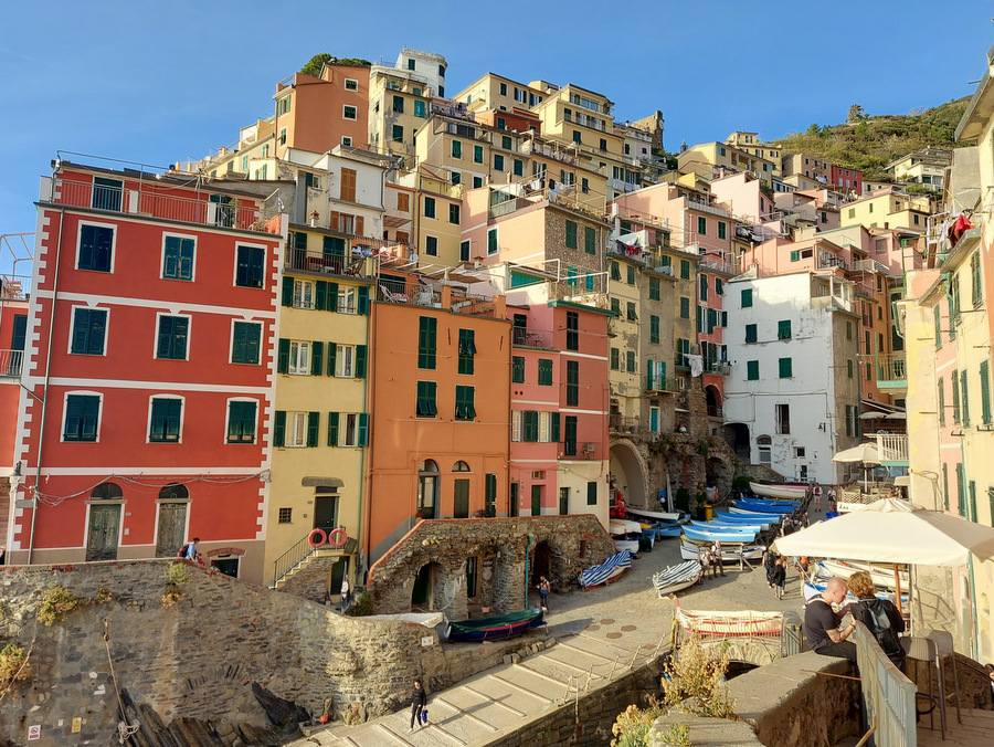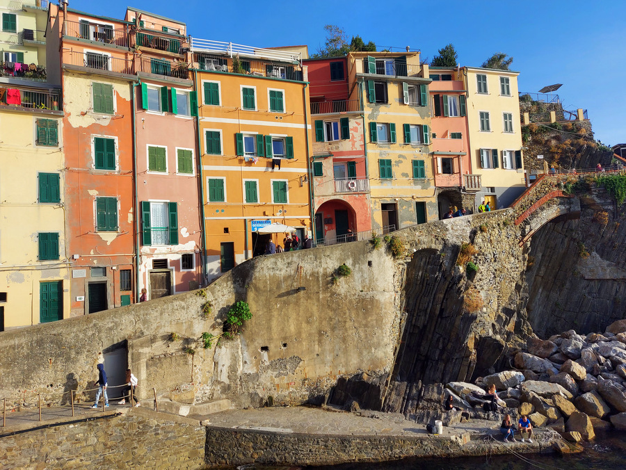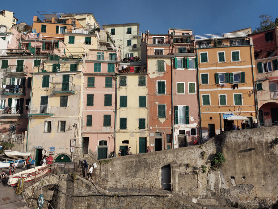 Riomaggiore (ca. 1.500 prebivalcev) znan po liniji hiš, ki se stekajo vse do obale ter veliko restavracijah in trgovinah ob glavni ulici Via Colombo.