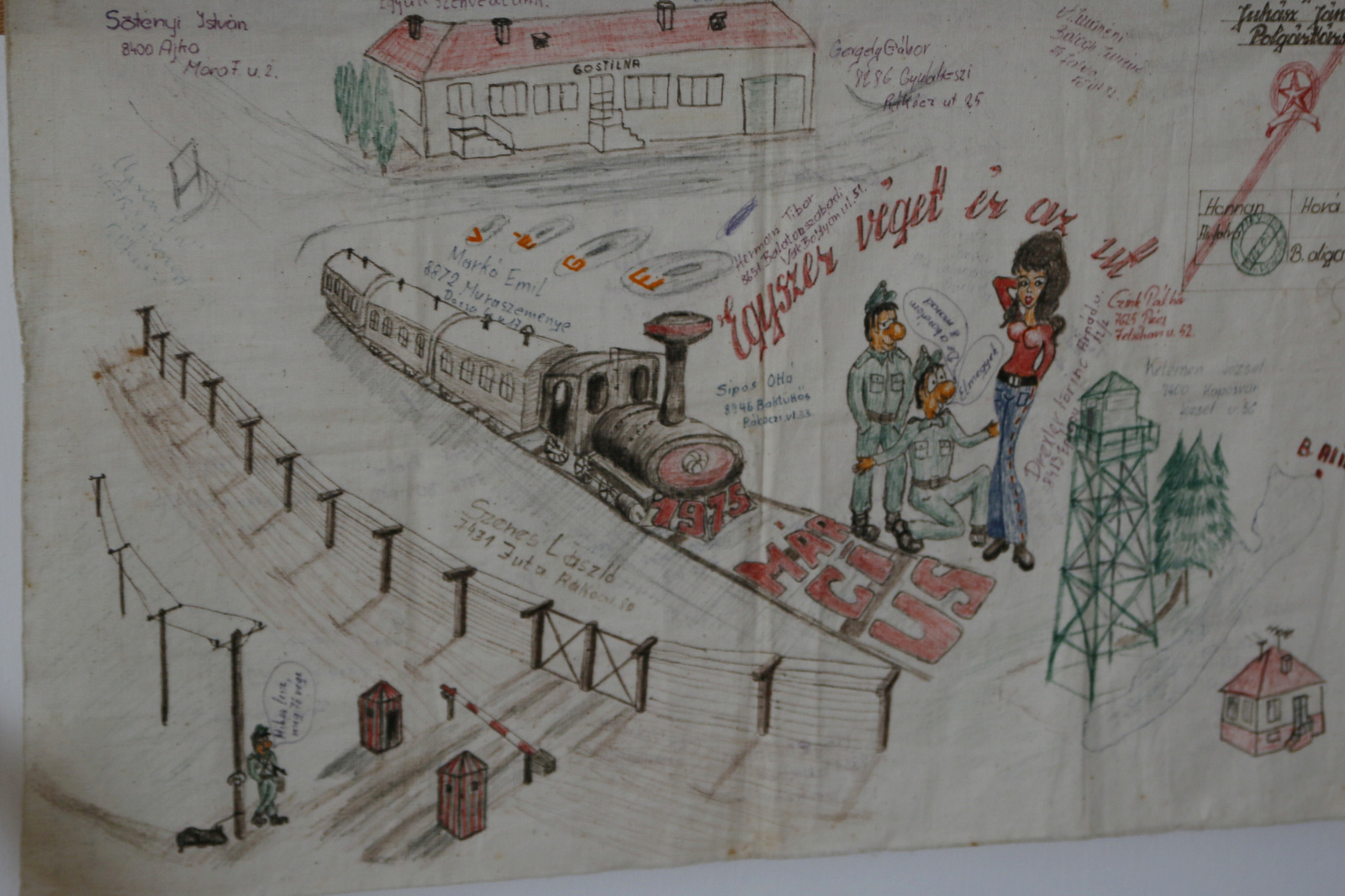 Razstavljeni predmeti iz različnih madžarskih obmejnih stražnic pričajo o življenju mejnih stražarjev. Del zbirke je namenjen obdobju po letu 1948, ko je bila meja s Slovenijo in z Avstrijo najbolj zastražena. Ogledamo si lahko naprave, ki so služile za nadzor meje in zveze med mejnimi stražarji, učne pripomočke za prepoznavanje letal ter tablo z magnetki, ki so ponazarjali posameznega stražarja in njegov dnevni položaj na terenu. V sosednjem prostoru so razstavljeni predmeti iz življenja v stražnici, jedilni in dnevni prostor ter uniforme stražarjev. V zadnji sobi je razstavljena maketa objektov Železne zavese in pripomočki, ki so jih begunci uporabljali za beg preko meje. Spoznamo kako pri ljudje želeli prelisičiti tukajšnje graničarje pri begu čez mejo, kako so želeli zabrisali svoje sledove z npr. lesenimi coklami z jelenovimi kopiti. Razstavljene so tudi spominske knjige z zgodbami prijav domačinov, ki so želeli zbežati čez mejo, pa tudi kako so si stražarji krajšali čas.