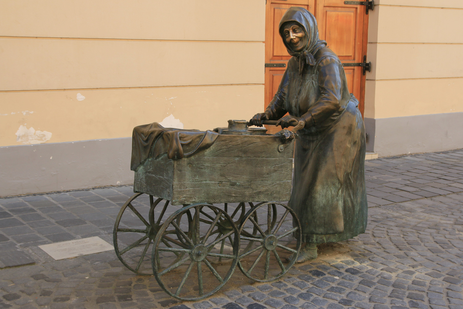 Stari del mesta je dokaj majhen ter ga hitro in zlahka obhodimo. Najprej nas pozdravi kip ženice Katice, ki z vozičkom vozi dnevno na tržnico svežo zelenjavo in mleko. Dotik njenega nosu naj bi prinesel srečo, zato je zglajen in sijoč. Malo naprej pridemo do zanimivega baročnega kompleksa treh hiš – HiemerFont-Caraffa-ovih, ki so bile pred dobrim desetletjem rekonstruirane v enotno satvboo. Danes se v njej nahaja prireditveni prostor, poročna dvorana, muzej igrač in prodajalna spominkov. Pred stavbo se nahaja spomenik v obliki bombnega kraterja in poškodovanega zvonu. V času druge svetovne vojne je bila med bombnim napadom poškodovana bližnja cistercijanska cerkev, s katere je padel na tla tudi zvon. Nasproti se nahaja Mestna hiša, kjer si lahko ogledamo muzejsko zbirko posvečeno kronanjem v mesto in med drugim repliko Svete krone (original se nahaja v Parlamentu v Budimpešti). Pred Mestno hišo se nahaja še zanimiv spomenik golega konjenika, posvečen huzarjem. To so bili težka konjenica s statusom elitnih enot, ki so se sprva bojevali s krivimi sabljami in pištolami, nato pa s karabinkami, na konjskem hrbtu. Značilni so bili za Madžarsko in Nemčijo.