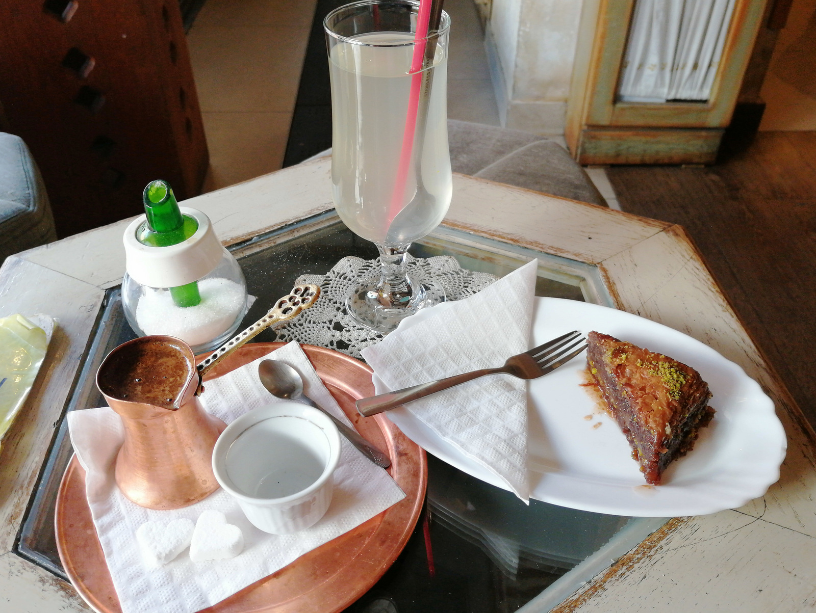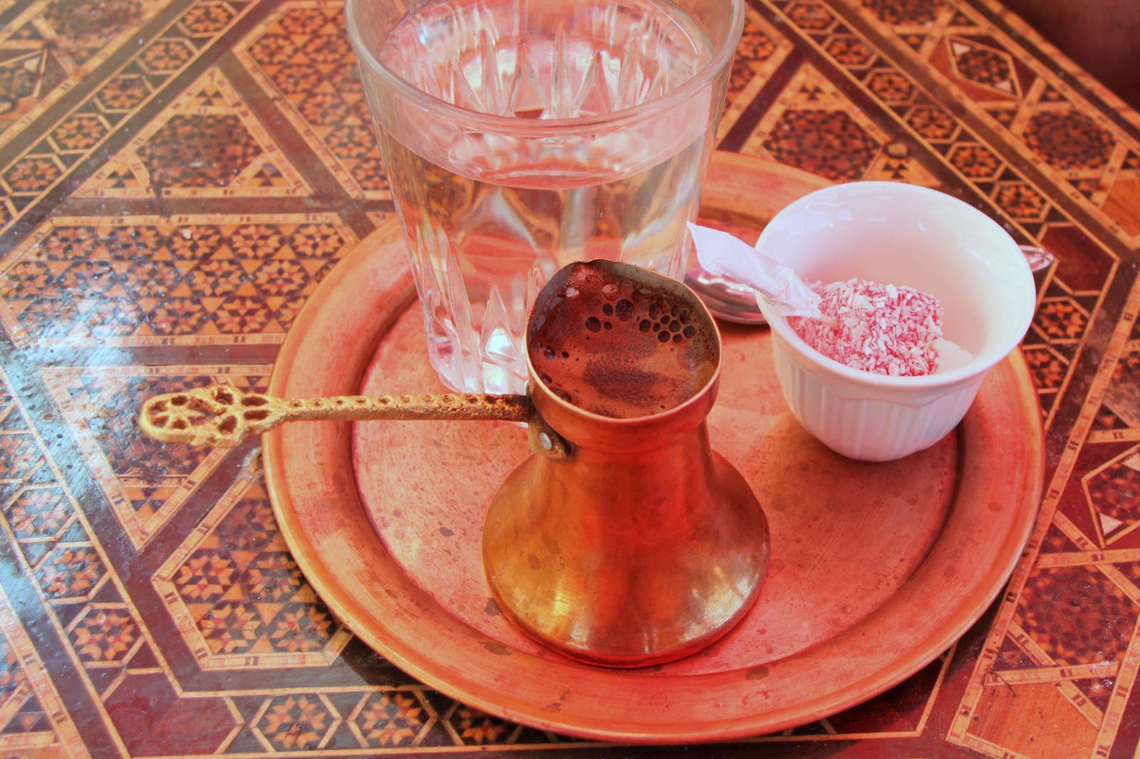 Pogosto boste na ličnem pladnju ob bosanski kahvi dobili še sladkorne kocke, rahat – lokum (ratluk) in manjši kozarec vode. Kaj uživati prvo? Priporoča se, da najprej pojeste rahat – lokum. Dobili ga boste z zobotrebcem, da si lahko na koncu očistite zobe morebitnih mandljev, orehov in drugih ostankov. Nato spijete kozarec vode, da nevtralizirate okus in da bi lahko nato čim bolj okusili aromo kave. Če imate radi sladko kavo, jo lahko grizljate med srkanjem kave, nekateri si položijo kocko sladkorja v usta in naredijo požirek kave čezenj ali pa sladkorne kocke namakajo v kavo. V res starih kavarnah, ki jih je danes že zelo težko najti, boste morda ob bosanski kahvi dobili še cigareto in šibico, saj je kajenje še vedno del »ćejfa« (dobro razpoloženje, radost, veselje, uživanje).
